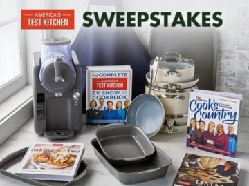 Grand Prize: An 11-piece cookware set, 4-piece bakeware set, 4 cookbooks, apron, and a 1-year subscription to America’s Test Kitchen online classes